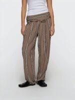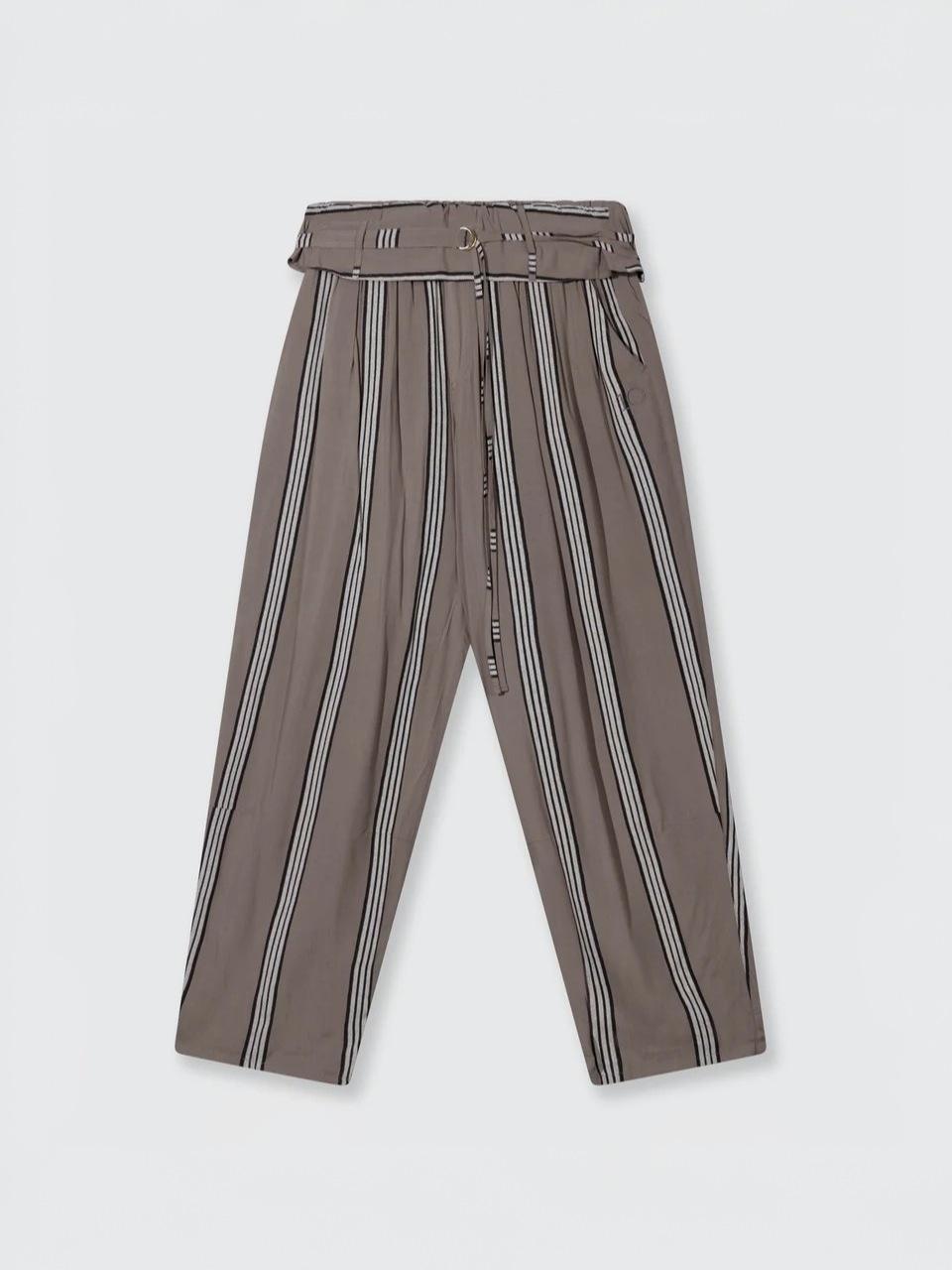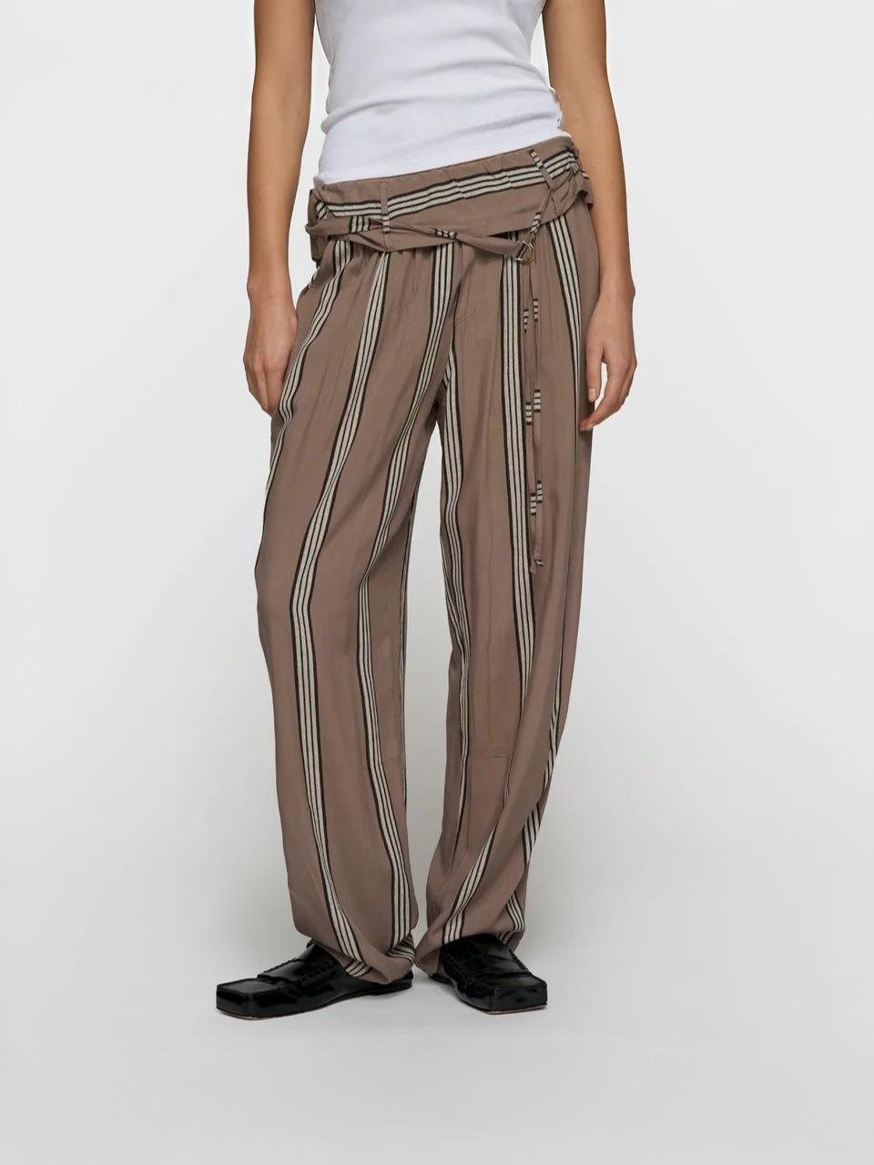 Relaxed Fit Hose gestreift, gefertigt aus geschmeidigem Viskosegewebe. Versehen mit einem Gummizugbund und doppelt umgeschlagenem Detail, Gürtel, Eingrifftaschen, einer Fake-Gesäßtasche sowie einer „10“-Monogrammstickerei unter der linken Eingrifftasche.