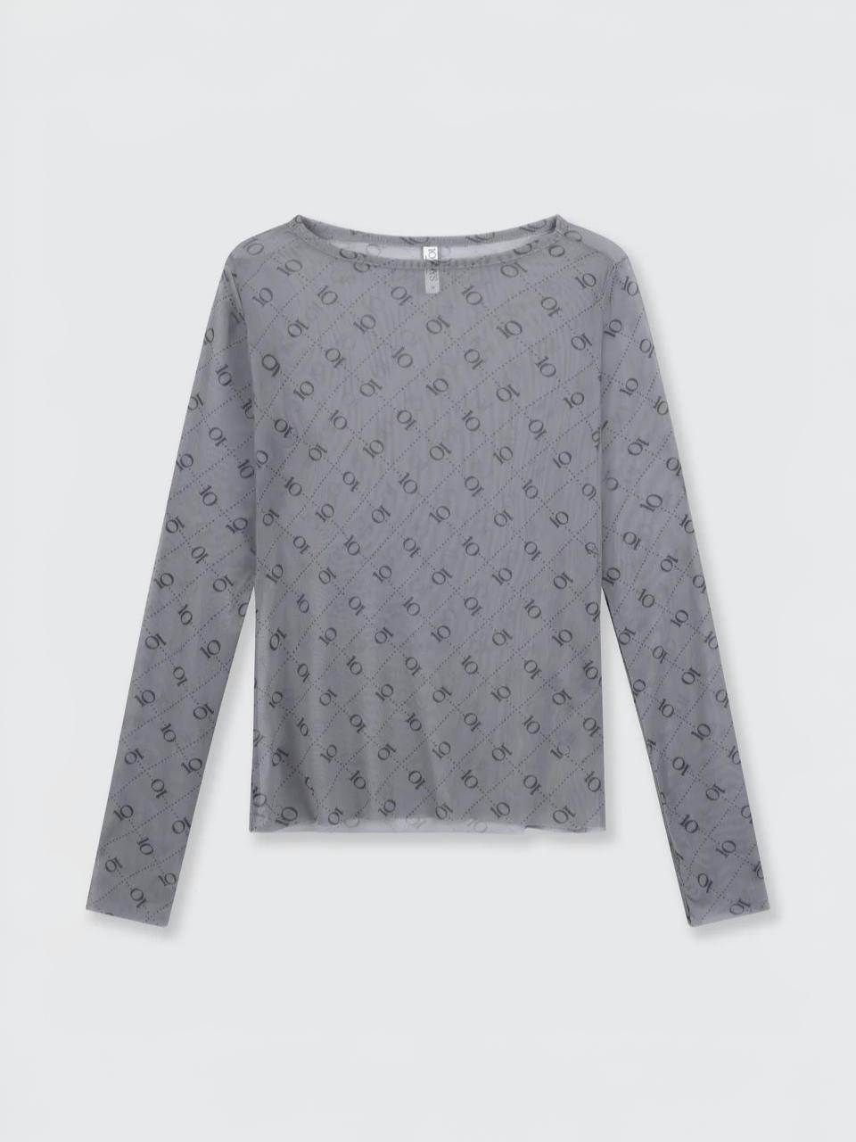 Slim Fit, transparentes Mesh Shirt mit Monogramm Aufdruck. Verfügt über einen breiten Bootsausschnitt, lange Ärmel mit Daumenlöchern und eine geschnittene Kante am Saum und an den Bündchen.