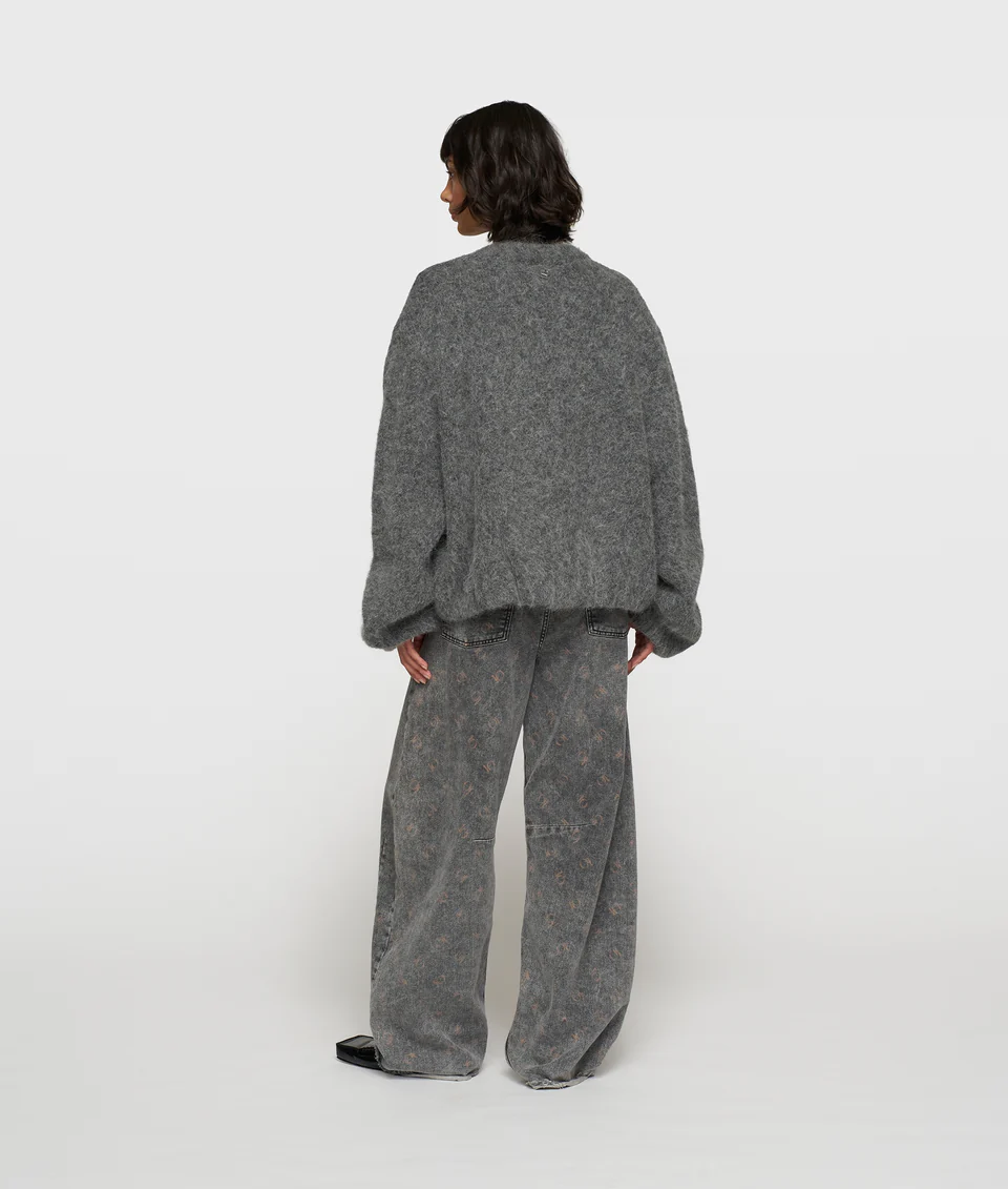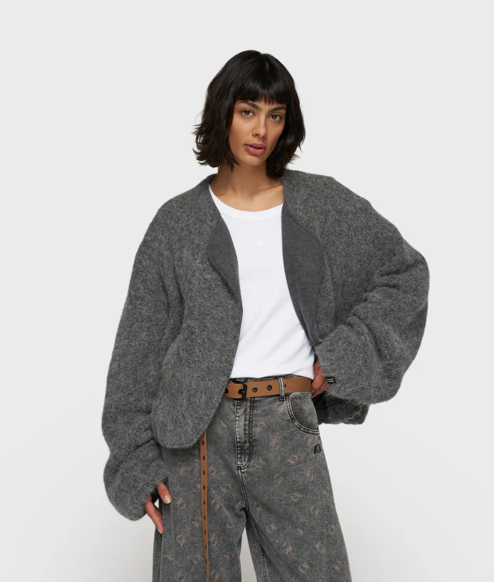 Oversized Strickjacke in Ballonform aus einem weichem Alpaka-Woll-Mix und einem weichem Baumwollinnenfutter. Mit plissierten, elastischen Ärmeln und Saum, einem auf dem linken Ärmel aufgestickten „10“-Monogramm und einer „10“-Monogramm-Perle auf dem Rücken.