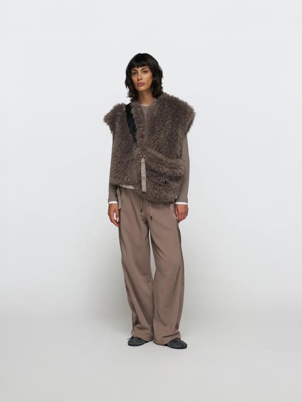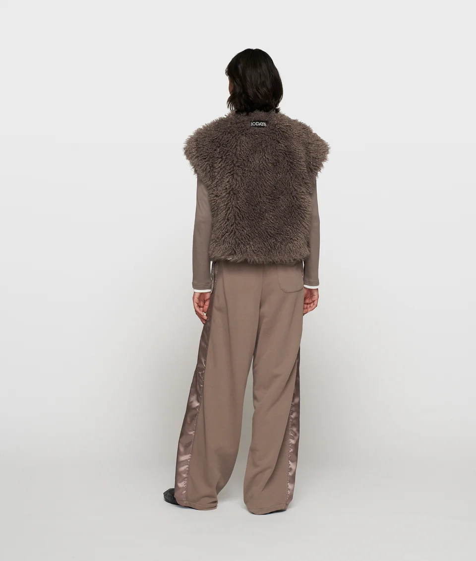 Kuschel Fell Weste mit Rundhalsausschnitt, einem Haken- und Ösenverschluss, Eingrifftaschen, Baumwollbändern unterhalb der Seitennähte mit 10DAYS-Gummiaufdrucken und einem 10DAYS-Label auf der Rückseite.