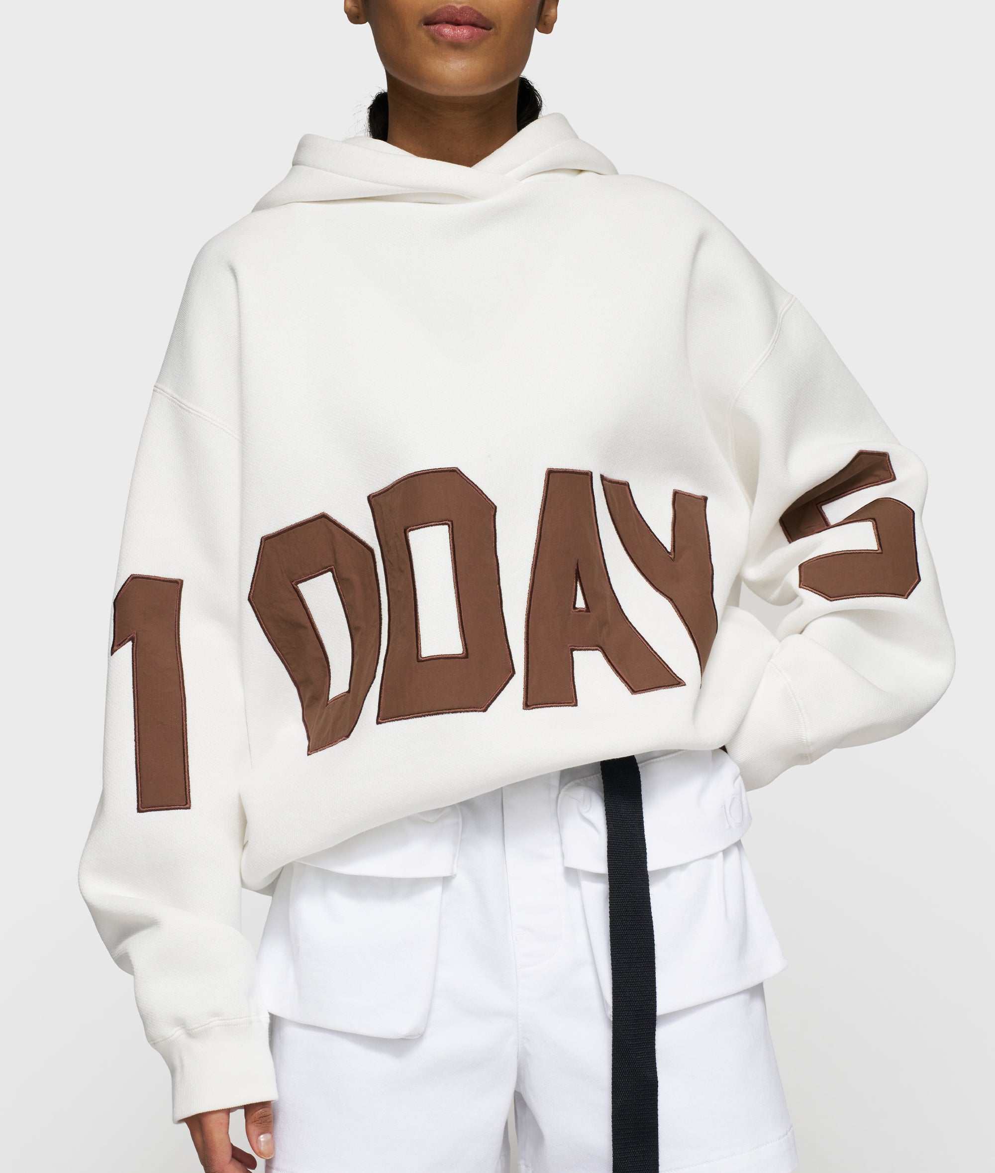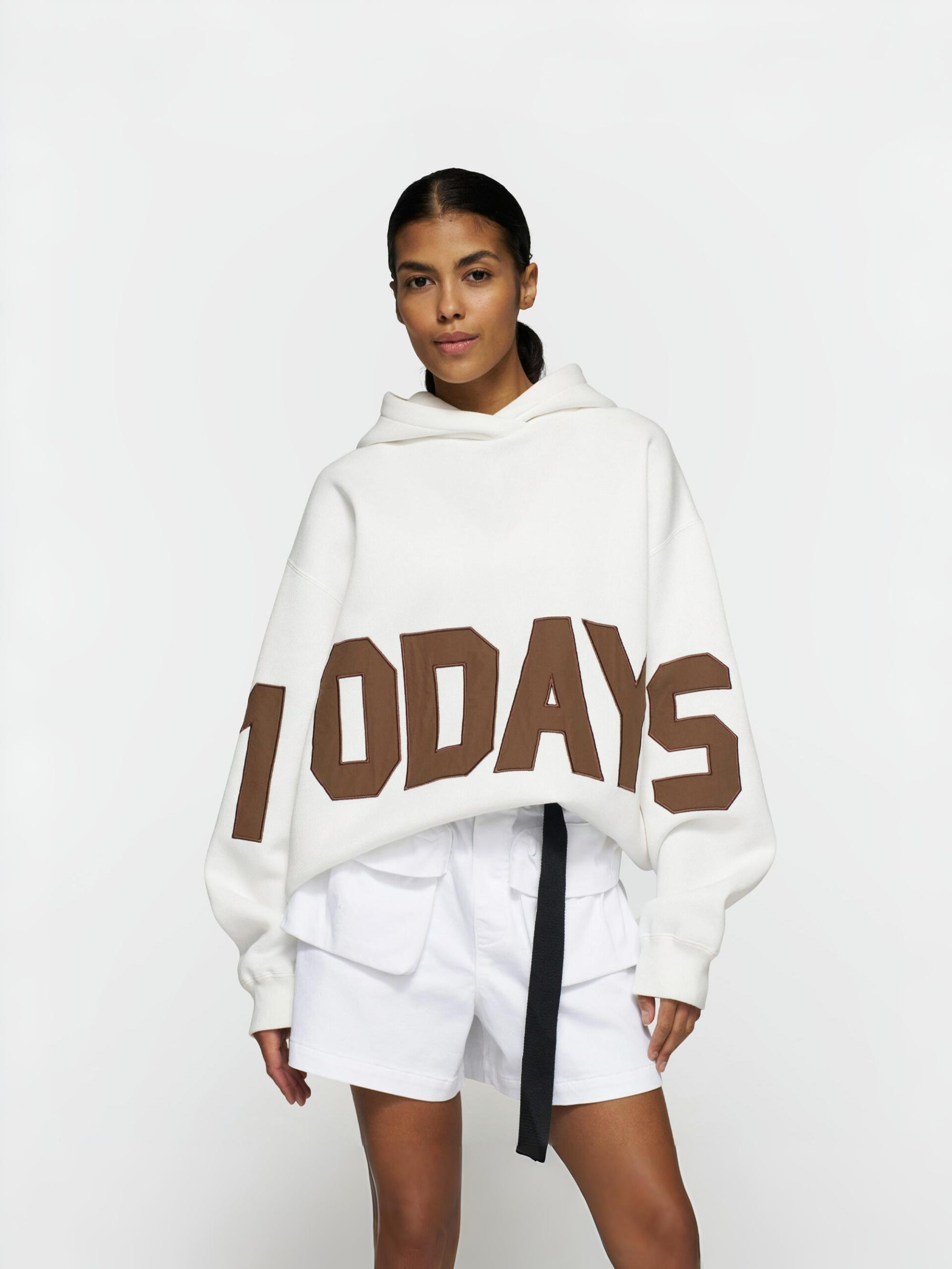 Relaxed Fit Statement Hoodie aus dichtem, gebürstetem Fleece. Das Sweatshirt ist an den Ärmeln und am Rumpf auf der Vorderseite mit einem großen 10DAYS-Logoaufnäher, einer Kapuze, Rippstrickbündchen und einem Raw-Edge-Saum ausgeführt.