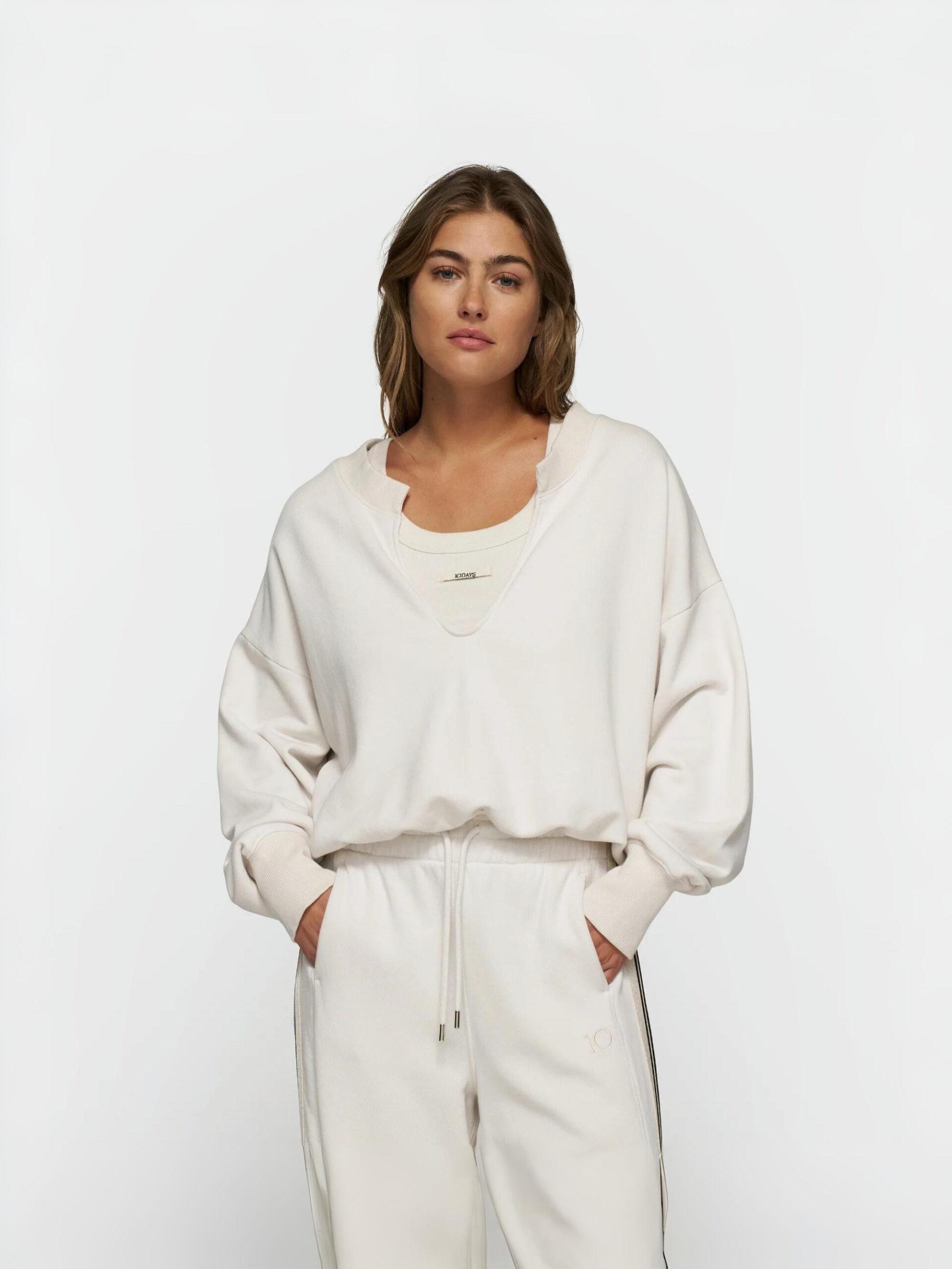 Relaxed Fit Sweater mit V-Ausschnitt aus einem weichen Baumwollfleece. Mit angesetztem Tanktop auf der Innenseite, rundem Rippstrick-Ausschnitt, Ballonsaum, Rippstrickbündchen und einem „10DAYS“-Canvaslabel auf der Vorderseite des Tanktops.
