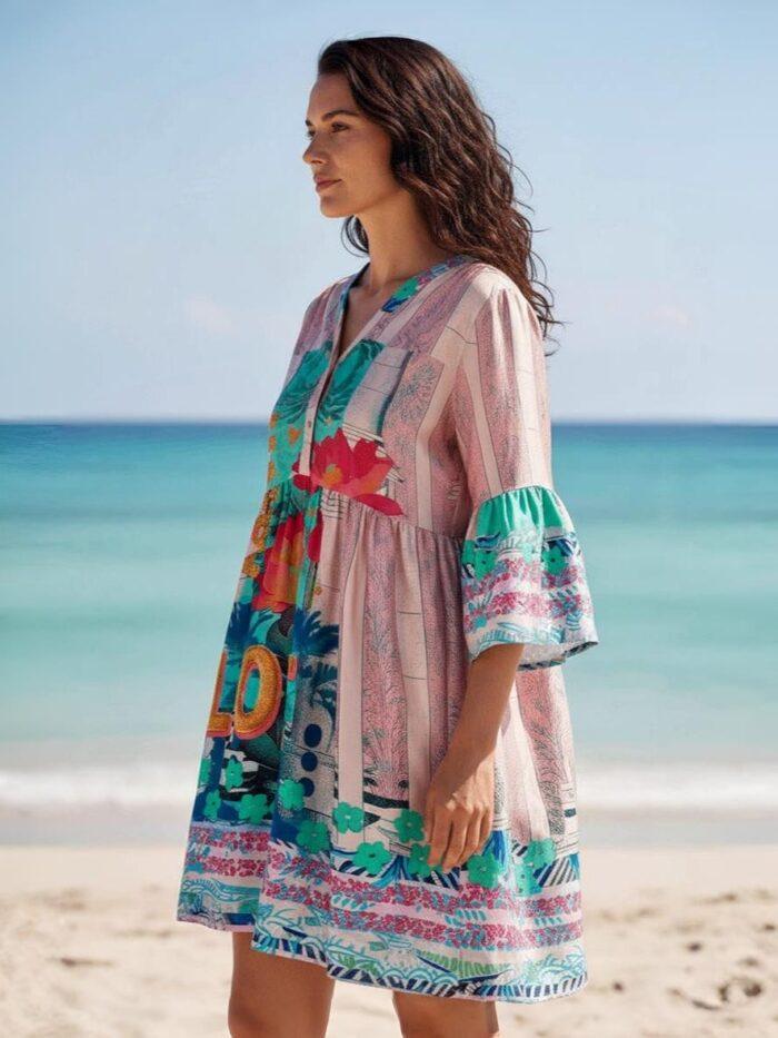 Feminines kurzes Kleid mit Trompeten-Ärmeln und großer Volant-Stufe für eine fließende Silhouette. Der V-Ausschnitt mit kleinem Stehkragen und Knopfleiste setzt einen stilvollen Akzent.