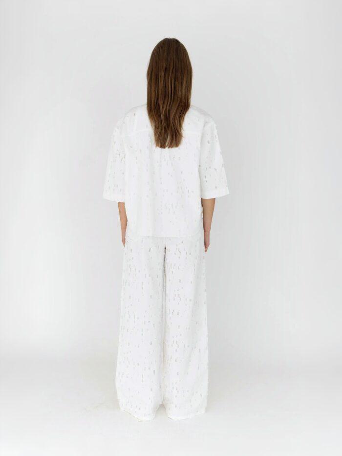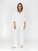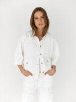 Sommerbluse Jacke in weiß mit offenen Details. Die Bluse hat eine oversized Passform und kurze Ärmel für ein leichtes und luftiges Gefühl. Auf der Vorderseite sind aufgesteckte Taschen für einen lässigen Look angebracht. Hergestellt aus 100 % Baumwolle und sorgt für Atmungsaktivität und Komfort. Ideal für warme Tage.
