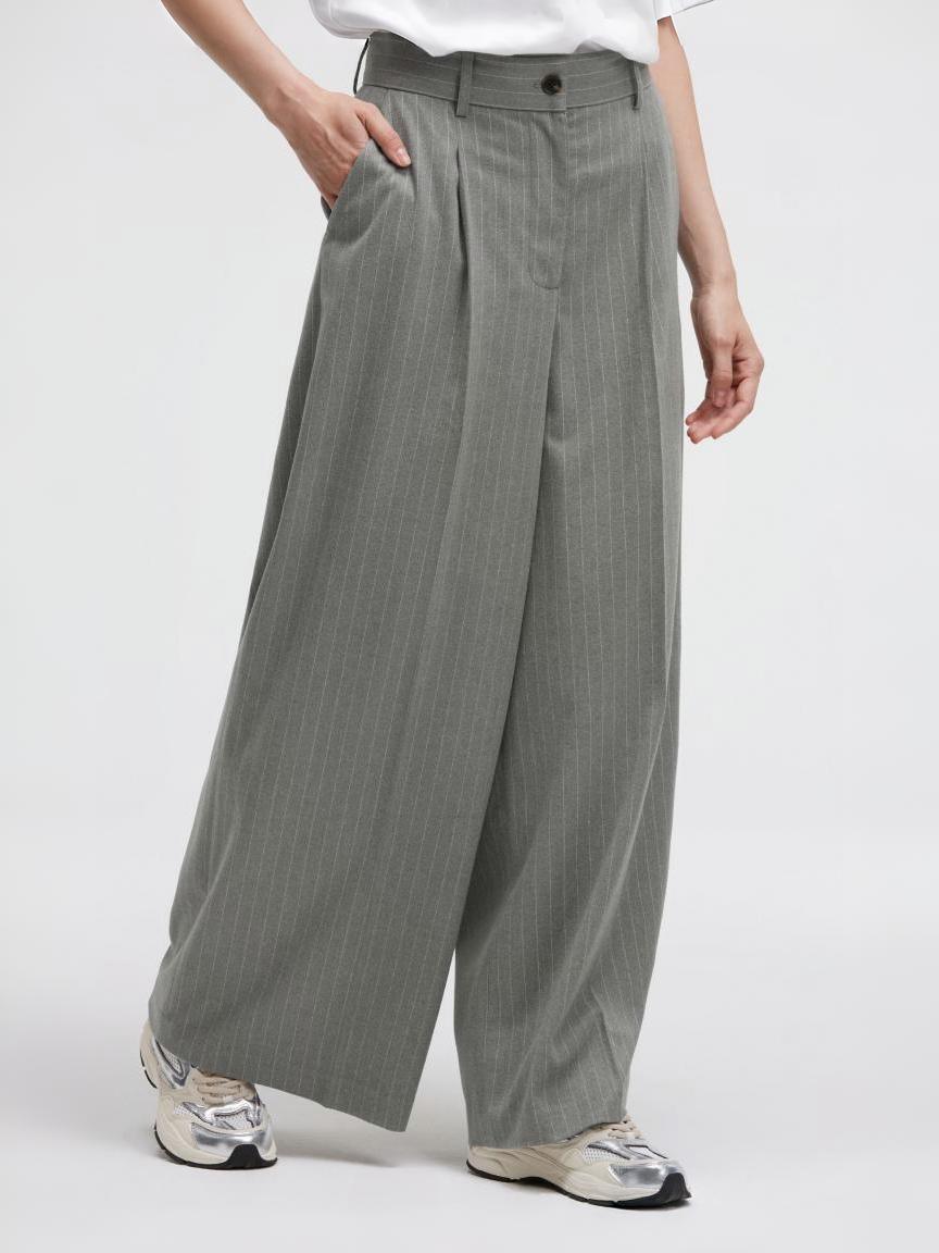 Hosen mit weitem Bein bleiben das It-Piece der Saison, ob im Office oder der Freizeit. Diese Nadelstreifenhose von SENSES.THE LABEL begeistert mit ihrem sehr weiten Beinverlauf und der eleganten Bundfalte. Gefertigt ist sie aus einem scheren Webstoff, der die Eleganz hervorhebt. Kombinieren kann man dazu einfach alles, von sportlich bis schick – dies betrifft die Oberteile, sowie die Schuhe. Das Model ist 177 cm groß und trägt Gr. S.