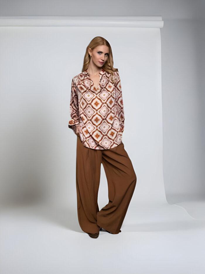 Shirtbluse mit kleinem Stehkragen und V-Ausschnitt in angesagten Herbstfarben